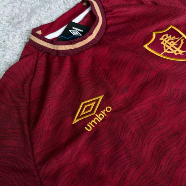 • Detalhes em Dourado: Escudo retrô do Fluminense e logotipo da Umbro aplicados em dourado, criando um contraste premium com o fundo grená.