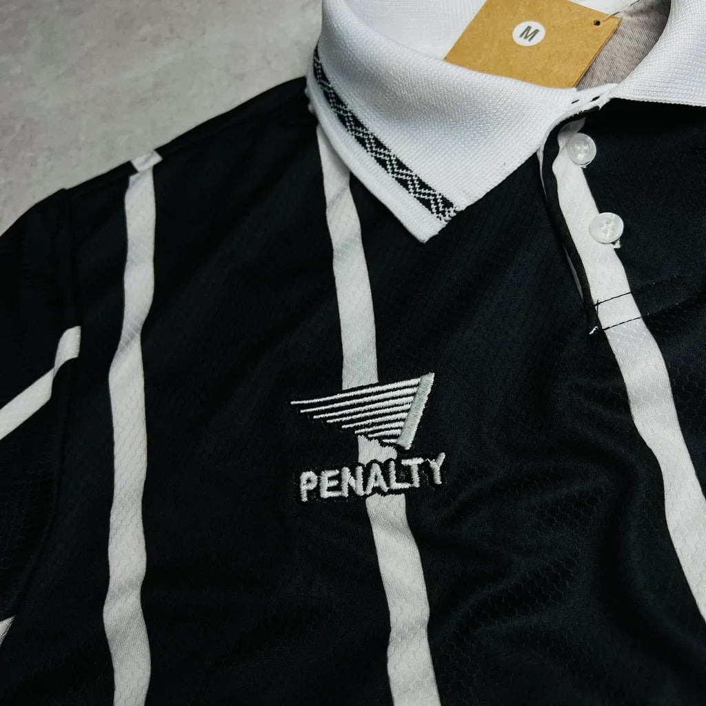 Detalhes de Época: Logotipo da Penalty bordado e gola branca com detalhes geométricos em preto.
