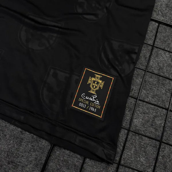 Possui escudo de Portugal em destaque, logos aplicados e estampa sutil com padrão personalizado por toda a camisa, garantindo um design moderno e premium.