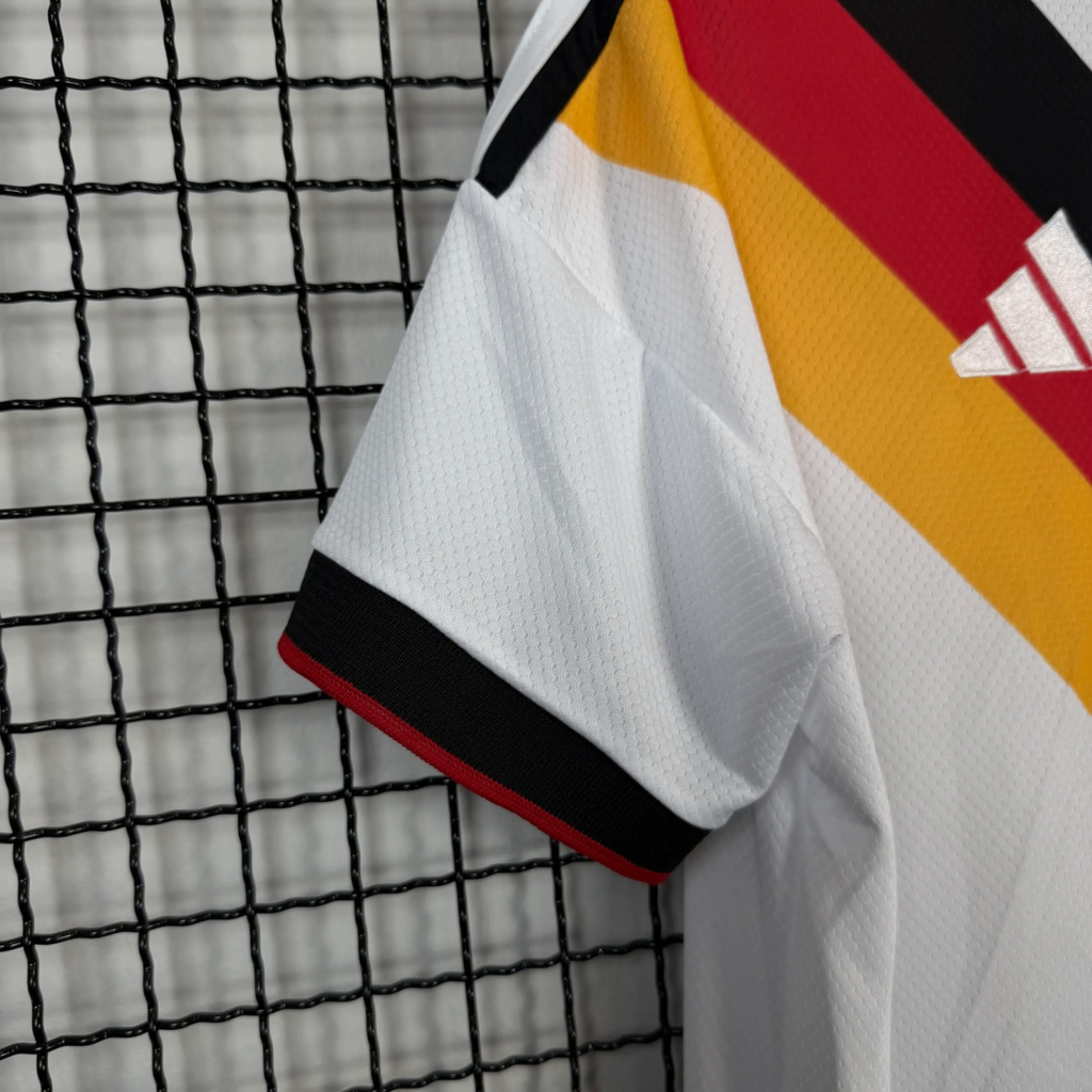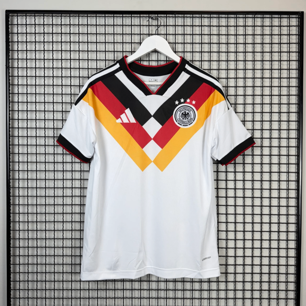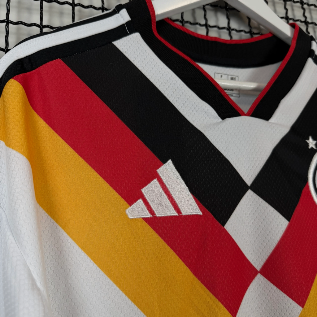 Camisa da Seleção Alemanha modelo titular branca para a Copa do Mundo 26/27. Tecido 100% poliéster com tecnologia de secagem rápida. Escudo bordado, detalhes clássicos e corte regular confortável. Perfeita para torcer com estilo.